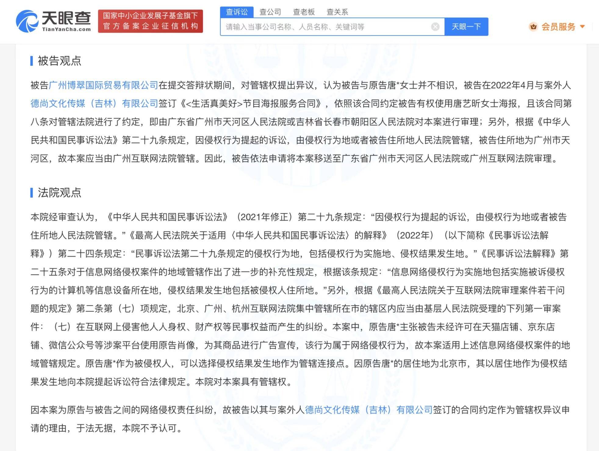 文书显示,原告唐婷请求法院判令被告博翠公司立即删除网店及微信公众号等涉案平台内所有含原告肖像、姓名的宣传物料,终止涉嫌侵权行为,向原告公开赔礼道歉,赔偿原告经济损失80万元及维权合理开支1000元。被告博翠公司对管辖权提出异议,称其与案外人德尚传媒公司签订《<生活真美好>节目海报服务合同》,约定被告有权使用唐艺昕女士海报,且该合同中对管辖法院进行了约定;被告住所地为广州市天河区,故本案应当由广州互联网法院管辖。