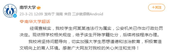 3月21日,南华大学给予该校本科应届毕业生何某某开除学籍处分。