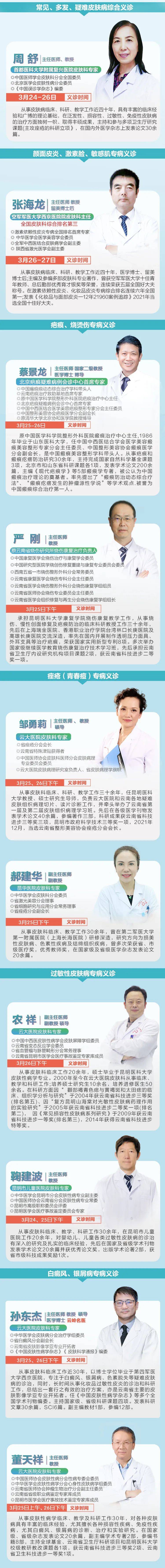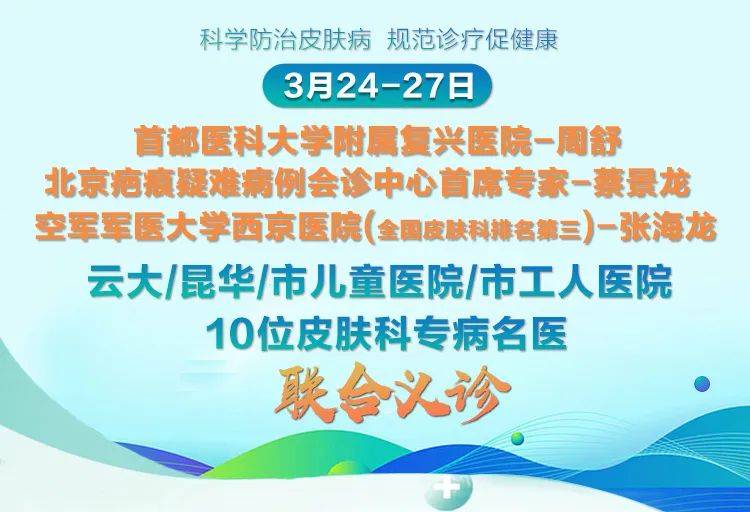 为更好地让昆明市及周边群众获得一线皮肤科名医的诊疗服务,加强大众皮肤病的防治工作、健康管理与规范治疗,3月24-27日,首都医科大学附属复兴医院周舒、空军军医大学西京医院(全国皮肤科排名第三)张海龙、全国疤痕综合治疗学科带头人蔡景龙将在昆明义诊,并与云大医院皮肤科邹勇莉、孙东杰、董天祥、农祥,昆华医院郝建华、昆明市儿童医院鞠剑波、市工人医院严刚共同携手,针对各种多发、疑难、顽固疾患,尤其是银屑病、荨麻疹、病理性疤痕等慢性病,为昆明及周边群众提供皮肤问题解决方案,欢迎广大市民咨询就诊。
