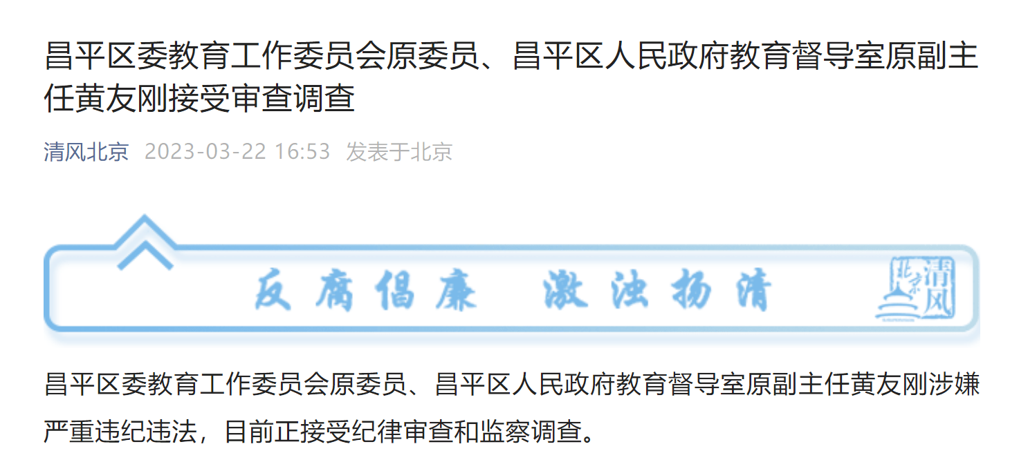 3月22日,据清风北京微信公众号:昌平区委教育工作委员会原委员、昌平区人民政府教育督导室原副主任黄友刚涉嫌严重违纪违法,目前正接受纪律审查和监察调查。