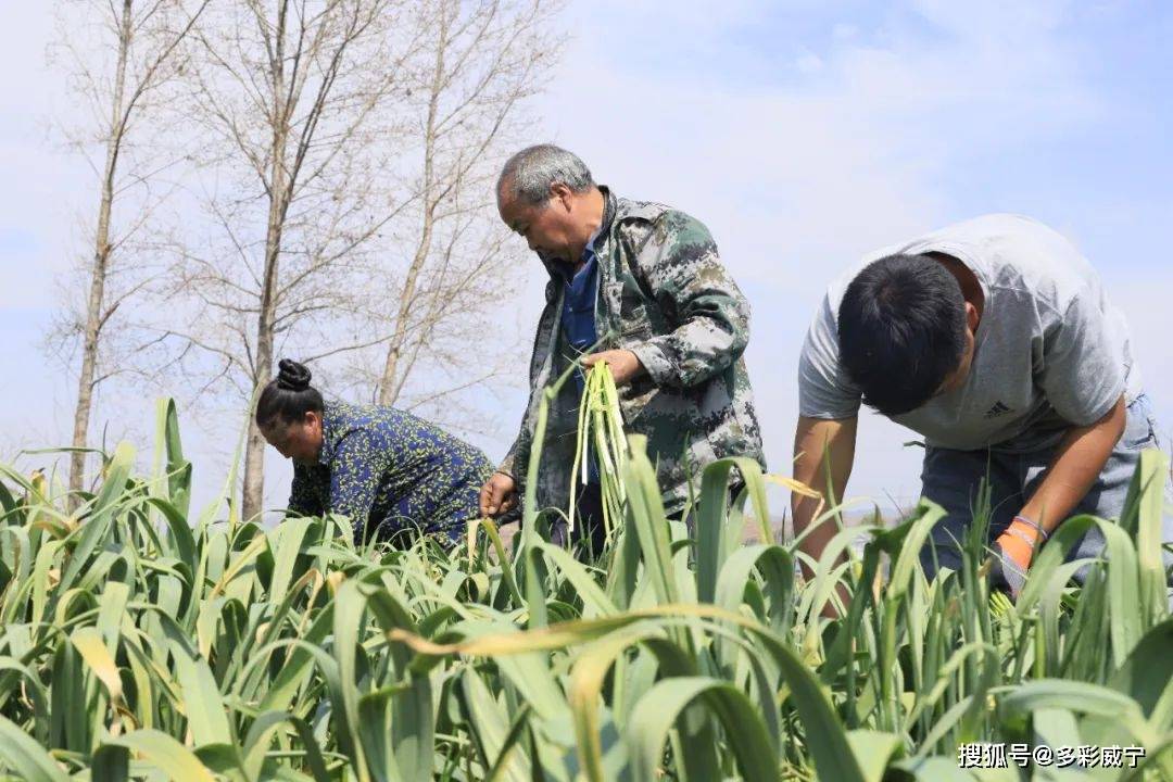 在村民马电吉家的蒜田里,蒜苗齐膝高,蒜苔嫩绿肥硕,一整片蒜田长势甚好。马电吉和妻子正在地里抽苔、捆扎,忙得不亦乐乎。他说现在正是蒜苔大量成熟的时候,他家也在抢抓时令,希望早点收完卖个好价钱。