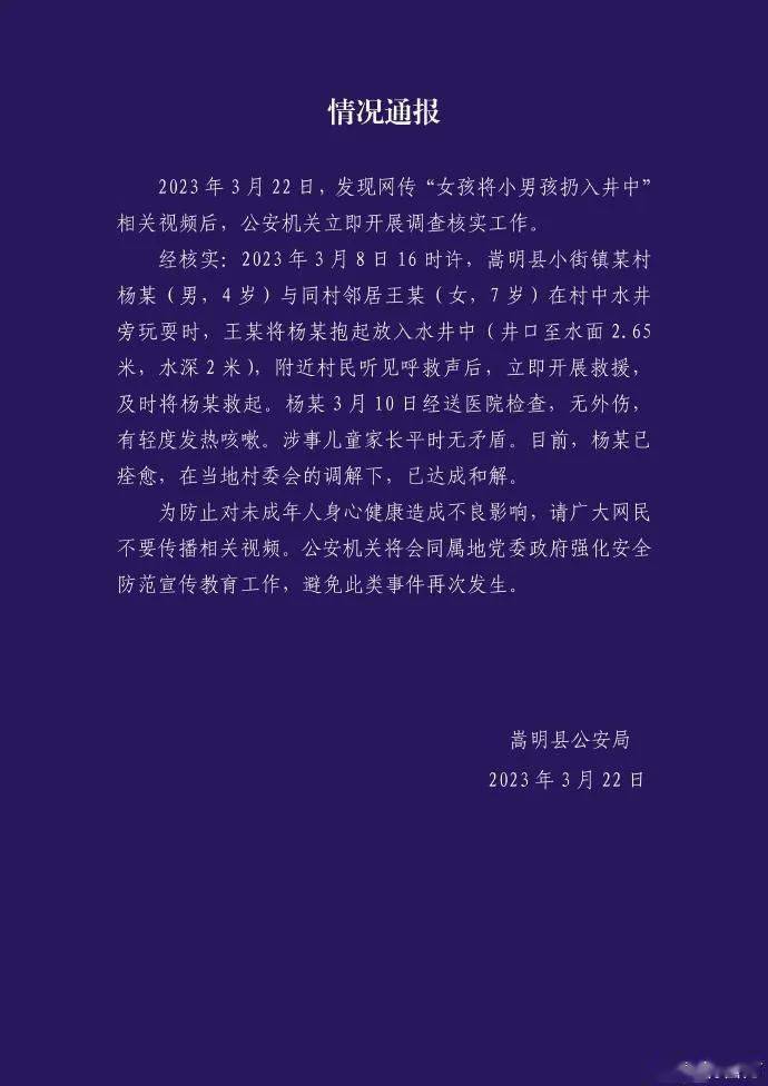 3月22日,一段“女孩将小男孩扔入井中”的视频在社交媒体上广泛流传。当晚,云南省嵩明县公安局通报,视频中的小男孩已痊愈,涉事双方已和解。