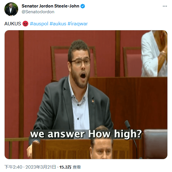 时隔半年,斯蒂尔-约翰再度在议会会议上炮轰AUKUS。当地时间21日,他将自己的发言视频发布在个人推特上。