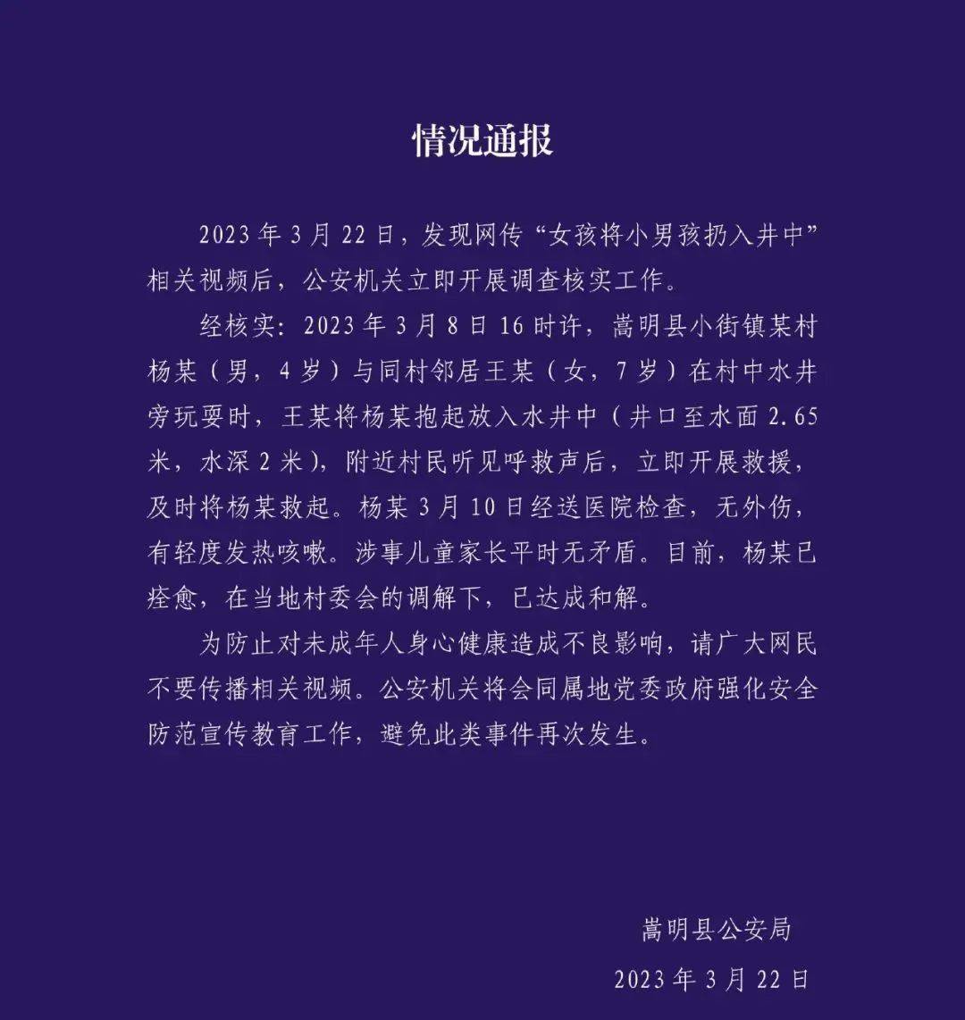 3月22日,一段小女孩将小男孩扔进井中视频引起广泛传播。红星新闻联系云南省昆明市嵩明县哈前村党总支书记李学军确认,视频内容系3月8日在当地发生,男童被扔下后,被附近大人救出。“(两个小孩是)邻居,小孩年纪还小,七岁零一点,双方家长已和解。”
