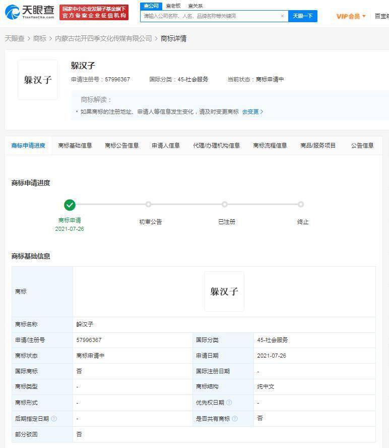 天眼查App显示,近日,内蒙古花开四季文化传媒有限公司申请注册多个“躲汉子”商标,国际分类涉及社会服务、运输工具等,目前商标状态均为申请中。该公司法定代表人为阿荣高娃,乌兰图雅与其在北京花开四季文化传媒有限公司分别担任监事和股东。