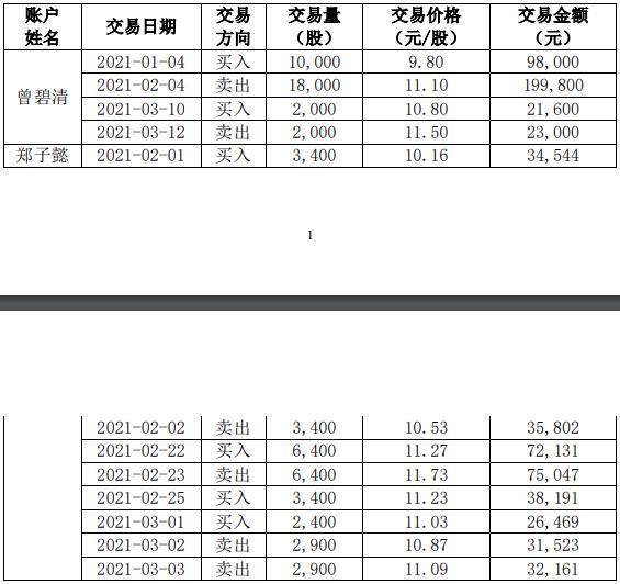 郑军儿子的证券账户于2021年2月1日至2021年3月3日期间,先后八次交易成都银行股票,短线交易所得收益3198元。