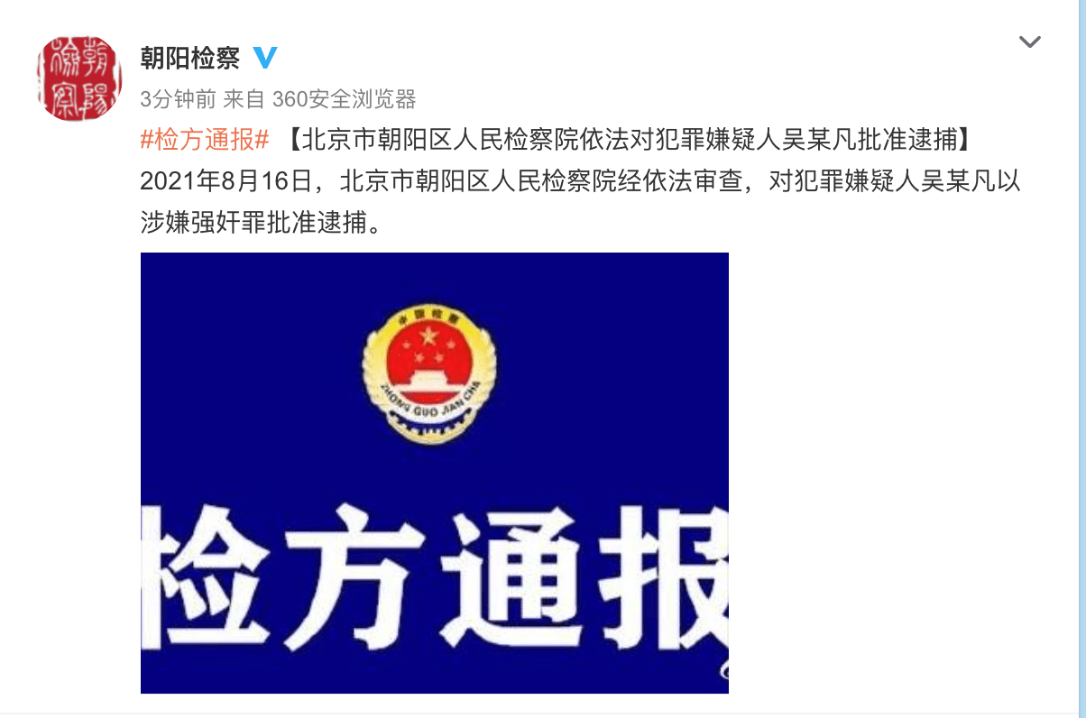 今天,北京市朝阳区人民检察院经依法审查,对犯罪嫌疑人吴某凡以涉嫌强奸罪批准逮捕。
