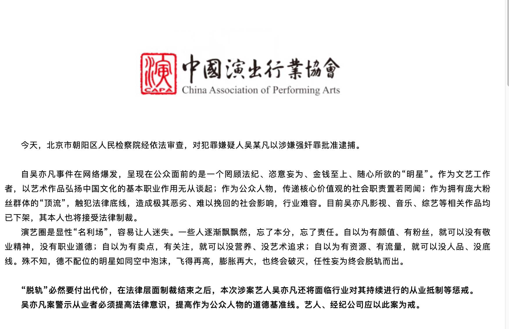 中国演出行业协会评价吴亦凡被捕事件:“脱轨”必然要付出代价,吴亦凡案警示从业者必须提高法律意识