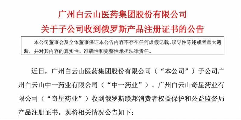 近日,广药集团旗下上市公司白云山公告披露,子公司广州白云山中一药业有限公司(下称白云山中一)的三七化痔丸、广州白云山奇星药业有限公司(下称白云山奇星)的复方南板蓝根颗粒,收到俄罗斯联邦消费者权益保护和公益监督局的产品注册证书。
