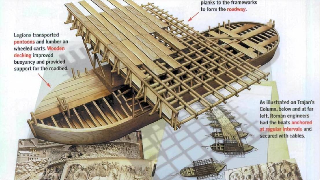 此后,新的工程负责人对结构做了微调,不再像之前那样要求在每个段落都密布船只载台。相反,还要彼此留出3米空档供湍急海流穿过,并在此基础上额外安排至少三处可供船只通行的缓冲缺口。但作为基座的每艘船都必须在同一侧沉下铁锚来加固自身稳定性。然后才是原产埃及的亚麻和草砂纸,被从来制作连接整座桥梁的缆绳。而且为降低人畜通过时的库难度,还会在铺设完的木板上增添灌木或泥土,形成更具摩擦力的普通路面。