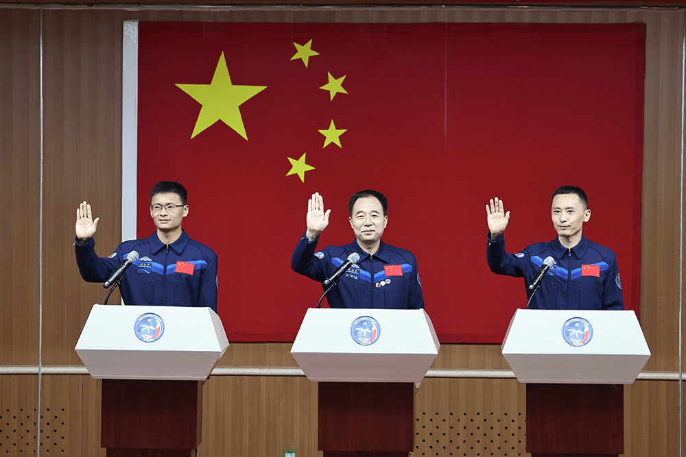 5月29日,神舟十六号航天员乘组与中外媒体记者见面。这是指令长景海鹏(中)、航天飞行工程师朱杨柱(右)、载荷专家桂海潮挥手致意。新华社 图