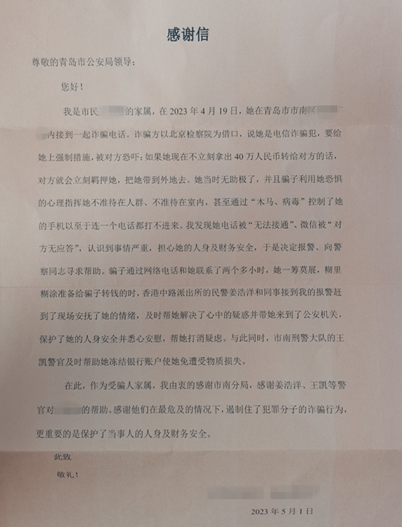 4月19日上午,香港中路派出所民警姜浩洋接到群众报警称,其家属王女士疑似被骗,目前情绪非常激动,拒不听从劝阻,且拒绝透露具体位置,现已失联。姜浩洋立即电话联系王女士发现她的手机已拒接所有来电,姜浩洋迅速开展工作,通过智慧警务综合分析研判出王女士的位置,并快速出警,终于在百丽广场附近一个角落处找到了神色慌张的王女士,此时王女士焦急慌张、眼神躲避,民警现场亮明身份后对王女士耐心开导,经了解,王女士接到自称是北京市人民检察院工作人员的来电,自称手中持有王女士的逮捕通知书,并谎称王女士涉嫌诈骗要对王女士的个人资金进行审查,要求王女士缴纳保证金40万元,否则就会被立即逮捕。王女士心中感到不安,担心自己的身份信息被盗用,导致卷入案件,就根据对方要求,在手机上安装了一个对方发来的APP软件,以此拦截一切电话和信息。随后又根据对方的要求提供了自己的银行卡号、银行卡绑定的手机号,并往银行账户内转账了40万元。就在对方要求王女士转账时,民警及时找到了王女士。民警了解情况后,立即开展劝阻,并告知王女士这是典型的冒充公检法诈骗,骗子谎称受害人涉嫌“洗钱” “诈骗”等罪名,制造紧张氛围,要求受害人缴纳保证金从而实施诈骗。在民警的劝导下,王女士及时终止转账。随后民警将情况立即汇报给市南分局刑侦大队反诈专班,第一时间对王女士的提供给诈骗分子的银行账户进行冻结,避免王女士的损失。5月1日,王女士向青岛市公安局赠送了感谢信,对民警姜浩洋的尽职尽责表示由衷的感谢。