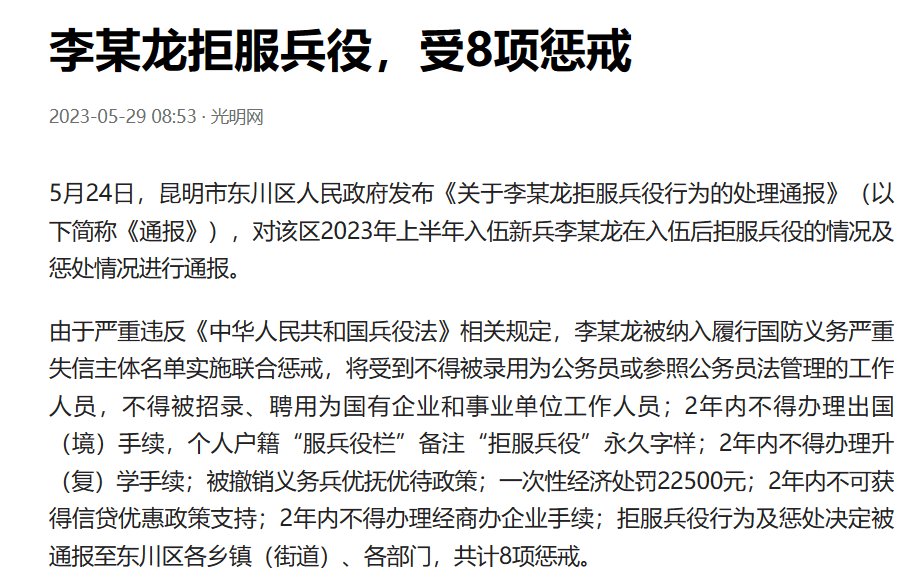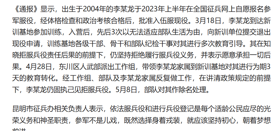 5月24日,昆明市通报了一名新兵入伍后拒服兵役的情况。