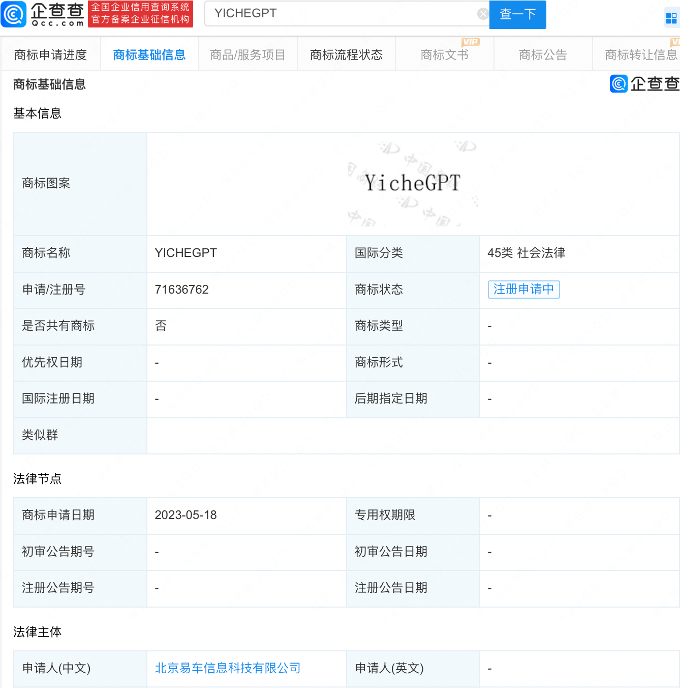 企查查APP显示,近日,北京易车信息科技有限公司申请注册“易车AI”“易车GPT”“YicheGPT”“AIcar”等商标,国际分类包括广告销售、教育娱乐、科学仪器等,当前商标状态均为注册申请中。