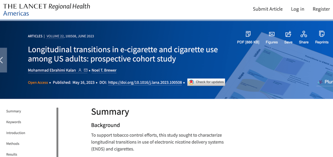 近日,国际权威期刊《柳叶刀-区域健康》(The Lancet Regional Health)发布的论文指出,电子烟在降低美国吸烟率(卷烟用户数/总人数*100%)方面发挥了有效作用,随着电子烟使用率的上升,美国卷烟使用率正逐年下降。