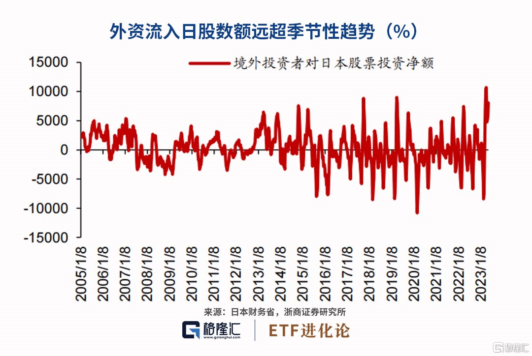 从资金流向来看,本轮日股上涨核心源于外资驱动。从近期流入资金来看,海外资金对日股的累计净买入额远超季节性特征。