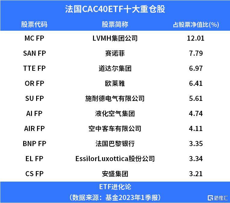 法国CAC40ETF年初至今收益率16%,一季度末这只基金重仓股有LVMH集团公司、赛诺菲、道达尔集团、欧莱雅、施耐德电气有限公司、液化空气集团、空中客车有限公司、法国巴黎银行、Essilor Luxottica股份公司、安盛集团。