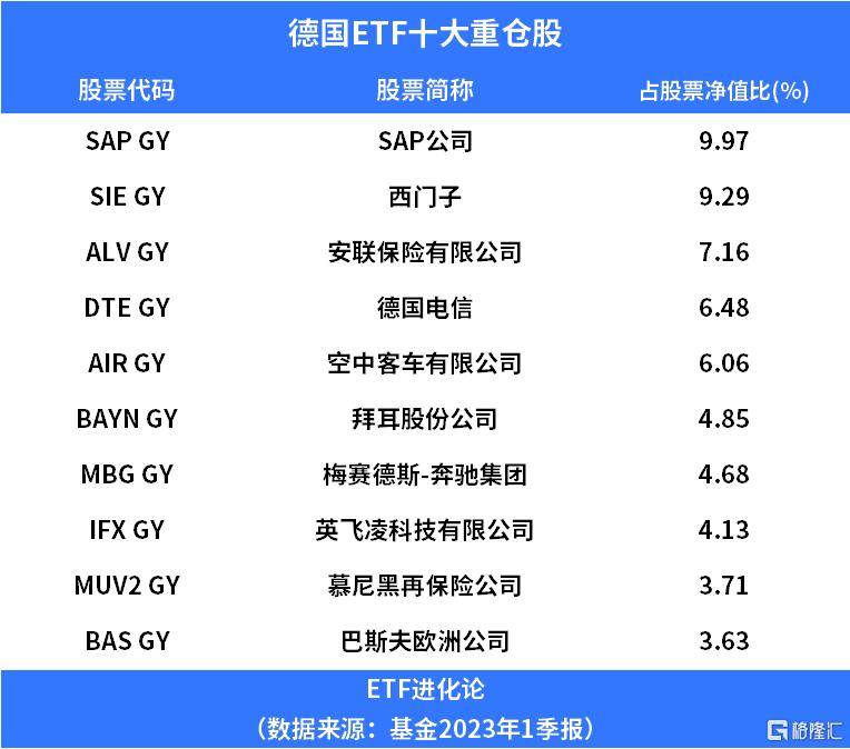 德国ETF年初至今收益率16%,今年一季度末,德国ETF基金重仓股包括SAP公司、西门子、安联保险、德国电信、空客、拜耳、梅赛德斯、英飞凌、巴斯夫欧洲等。