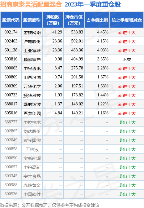 招商康泰灵活配置混合的前十大重仓股如下: