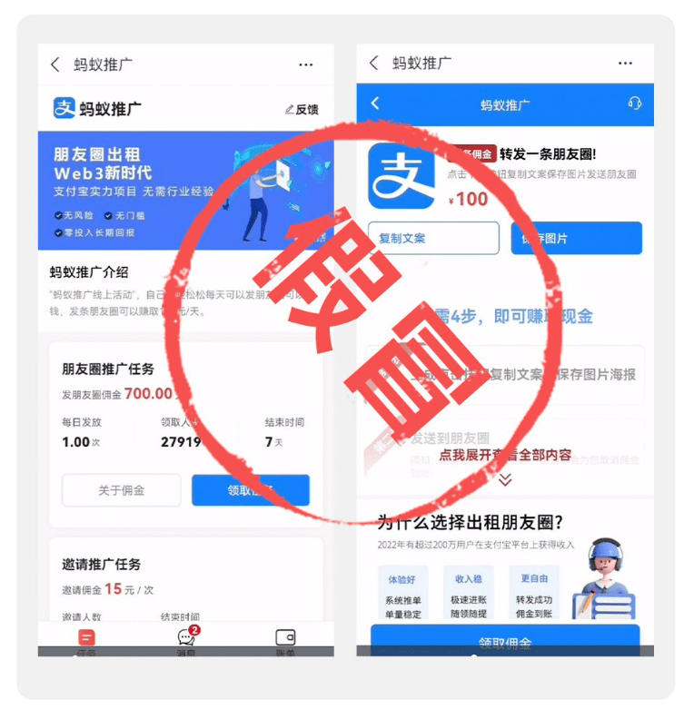 据介绍, 支付宝没有“蚂蚁推广”“支付宝推广”等项目,也没有“朋友圈出租”等赚钱活动。此类活动均为诈骗。