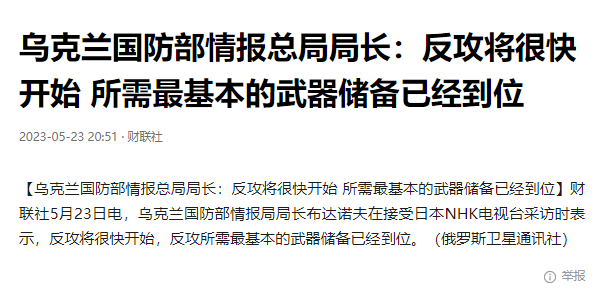 在乌克兰放出“ 俄罗斯自由军团 ”这支猛虎扑向俄境内别尔哥罗德之后,乌克兰国防部情报局局长布达诺夫对外称“ 反攻将很快开始,所需武器储备已经到位 ”的消息: