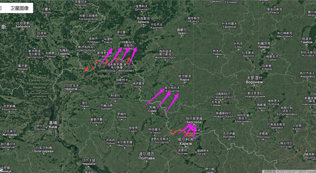 下图是对俄边境几个州的攻击简图,红色是地面跨境攻击,紫色是无人机和远程炮火攻击。