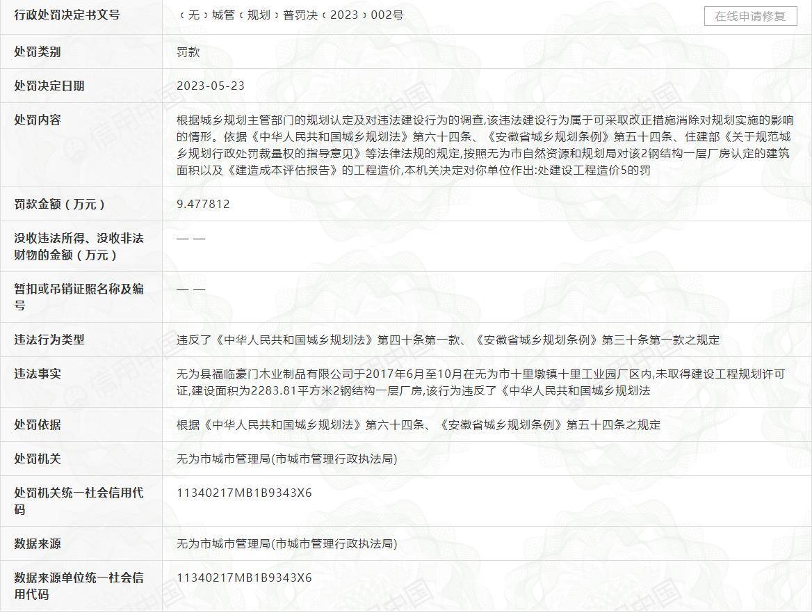 原标题:无为县福临豪门木业违规建设被罚9.47万余元