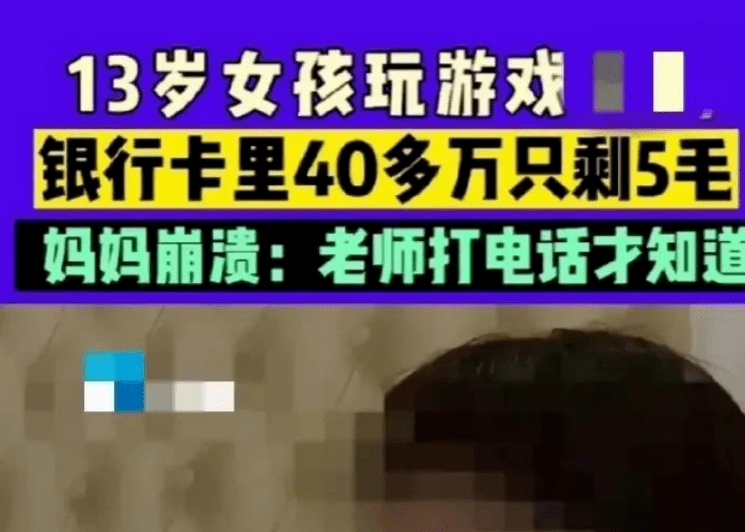 据孩子妈妈说,自家闺女上初一,平常住校不回家,突然有一天孩子的老师给她打电话,说孩子偷玩游戏,让她赶紧查看银行账户,妈妈查看后发现40万只剩下5毛。