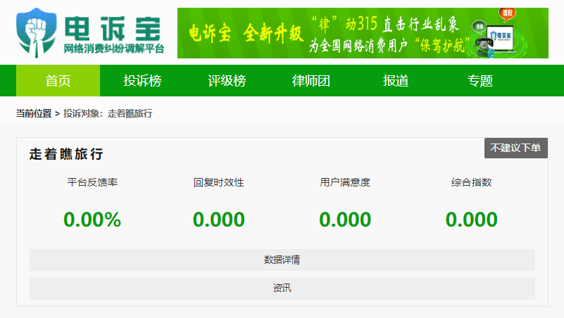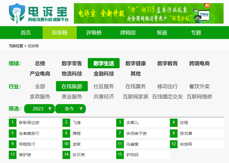 根据“电诉宝”2023年至今受理的在线旅游领域用户有效投诉显示,走着瞧旅行排名第五位,最新评级为“不建议下单”。其他被投诉的类似平台按投诉量排名依次为:联联周边游、飞猪、去哪儿、如程、携程、侠侣亲子游、旅划算、同程旅行、途家、马蜂窝、穷游网、骑驴游、彩贝壳、驴妈妈。