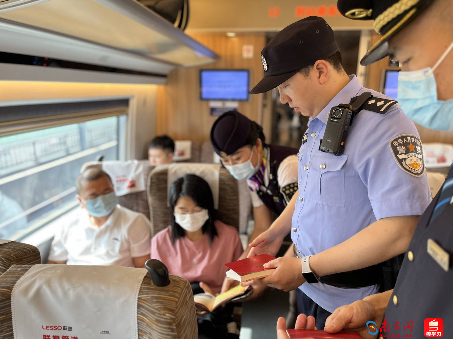 广九客运段高铁动四车队党支部书记伍辉利表示,为进一步落实好民法典宣传月活动,团队提前组织策划,与铁路公安一起将法律服务送到一线,让法律法规走进旅客生活。