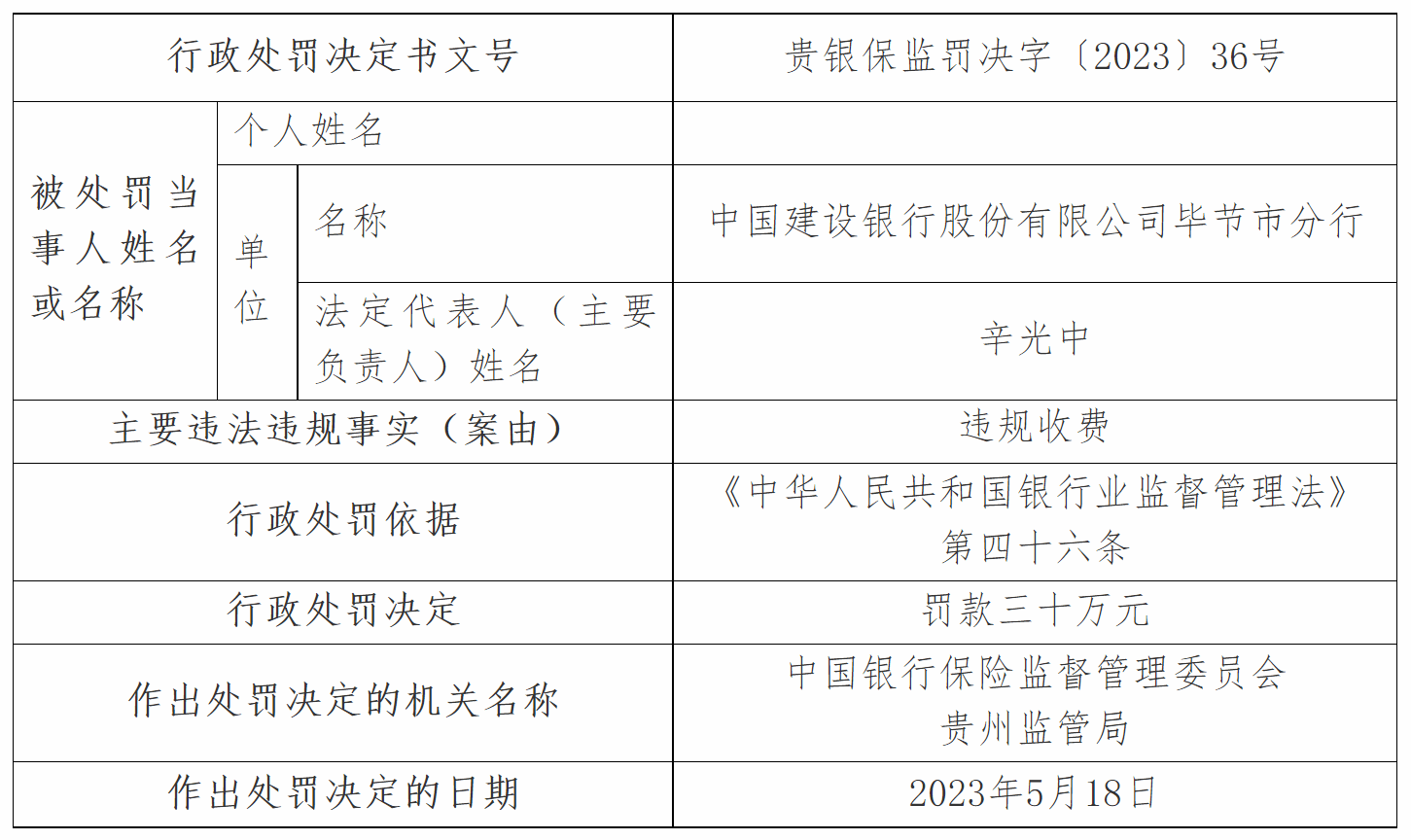 原标题:建设银行毕节市分行因违规收费被罚款30万元