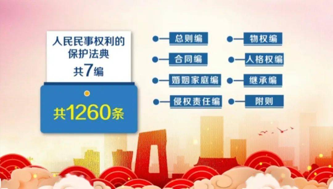 民法典共7编、1260条,各编依次为总则、物权、合同、人格权、婚姻家庭、继承、侵权责任,以及附则。通篇贯穿以人民为中心的发展思想,着眼满足人民对美好生活的需要,对公民的人身权、财产权、人格权等作出明确详实的规定,并规定侵权责任,明确权利受到削弱、减损、侵害时的请求权和救济权等,体现了对人民权利的充分保障,被誉为“新时代人民权利的宣言书”,也是“社会生活的百科全书”。
