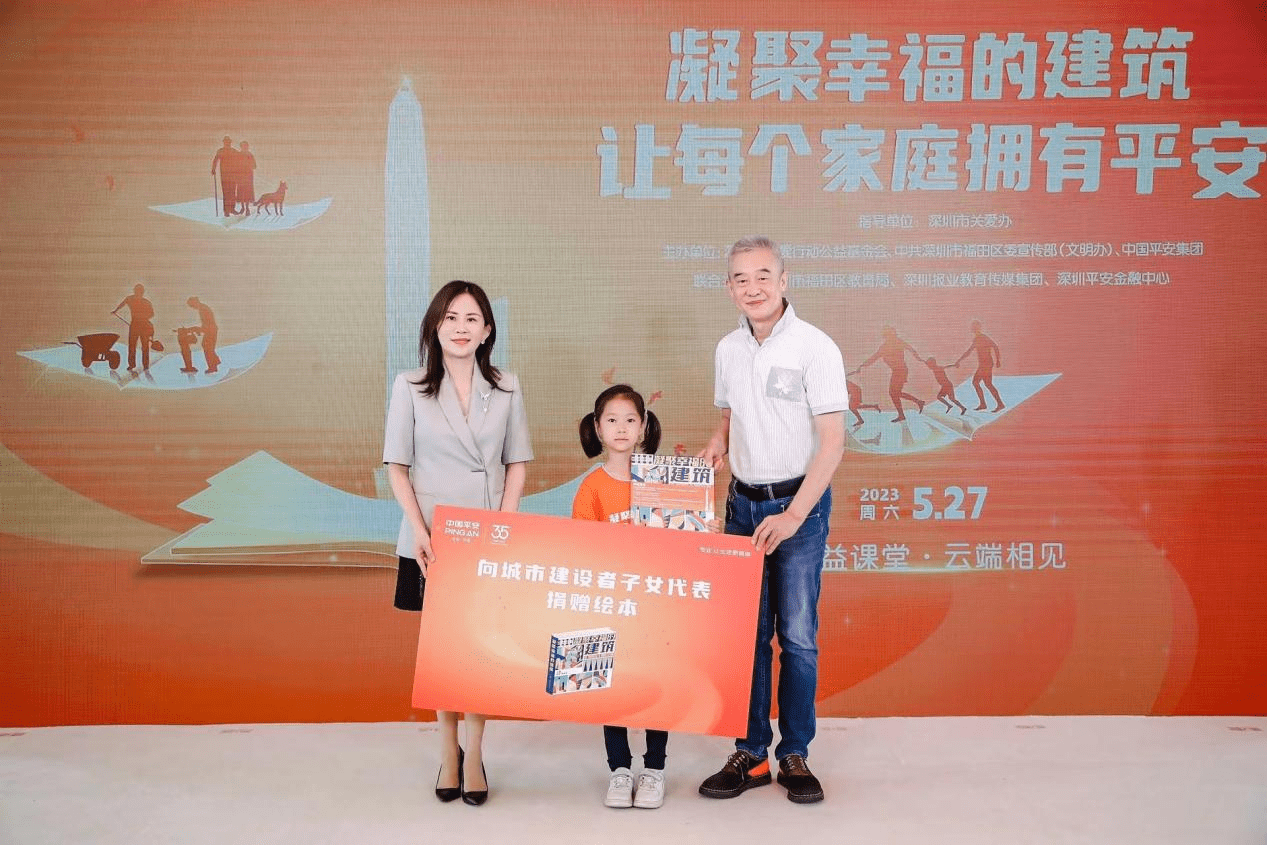 活动中,福田区新时代文明实践中心代表为平安志愿者颁发聘书,邀请他们成为首批公益讲师,并在活动现场为城市建设者子女代表开启首场公益课堂。同时,深圳市关爱行动公益基金会理事长张占恒、平安集团代表也一起为城市建设者子女代表捐赠了《凝聚幸福的建筑》科普绘本。