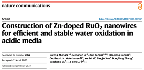 近期,河南理工大学教师张大峰博士与英国谢菲尔德大学雍雪博士、郑州大学卢思宇教授合作在国际著名期刊《Nature Communications》(中科院一区top期刊,Nature Index期刊,影响因子:17.694)发表题为《酸性介质中高效稳定催化水氧化的锌掺杂二氧化钌纳米线的构筑》(《Construction of Zn-doped RuO2 nanowires for efficient and stable water oxidation in acidic media》)的研究成果。