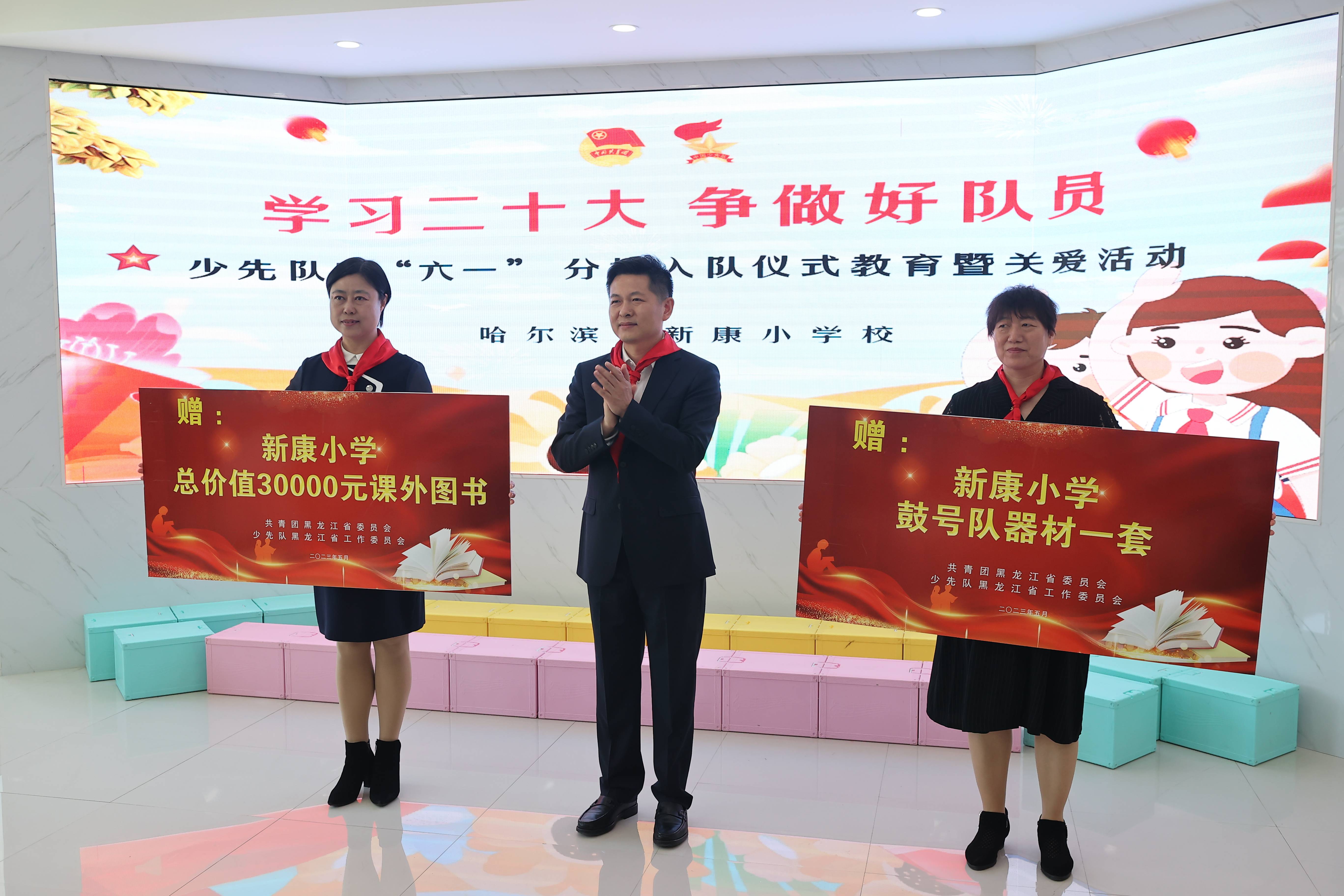 在“六一”国际儿童节前夕,团 黑龙江省委、省少工委、团市委、市教育局、市妇联、道里区委组成的爱心慰问团队,来到哈尔滨市新康小学校看望小朋友们,向少年儿童送去节日祝福。活动中同步开展了新队员入队仪式,16名儿童光荣地加入了少先队,团省委副书记代表团省委、省少工委为学校捐赠了少先队鼓乐器材,为留守及困境儿童送去了价值3万余元的课外图书,市、区各部门负责同志为少先队员们赠送了爱心书包和文具用品。