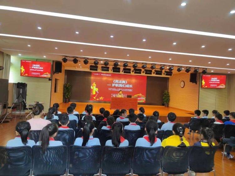 现场,法治专员针对当前青少年学生的特点,结合未成年人网络打赏的案例,深入浅出地向同学们阐释民法典的基本理念、价值以及涉及青少年的重要法律内容并通过现场讲座和视频同步转播的形式为三年级200多名学生带来一场民法“盛宴”。