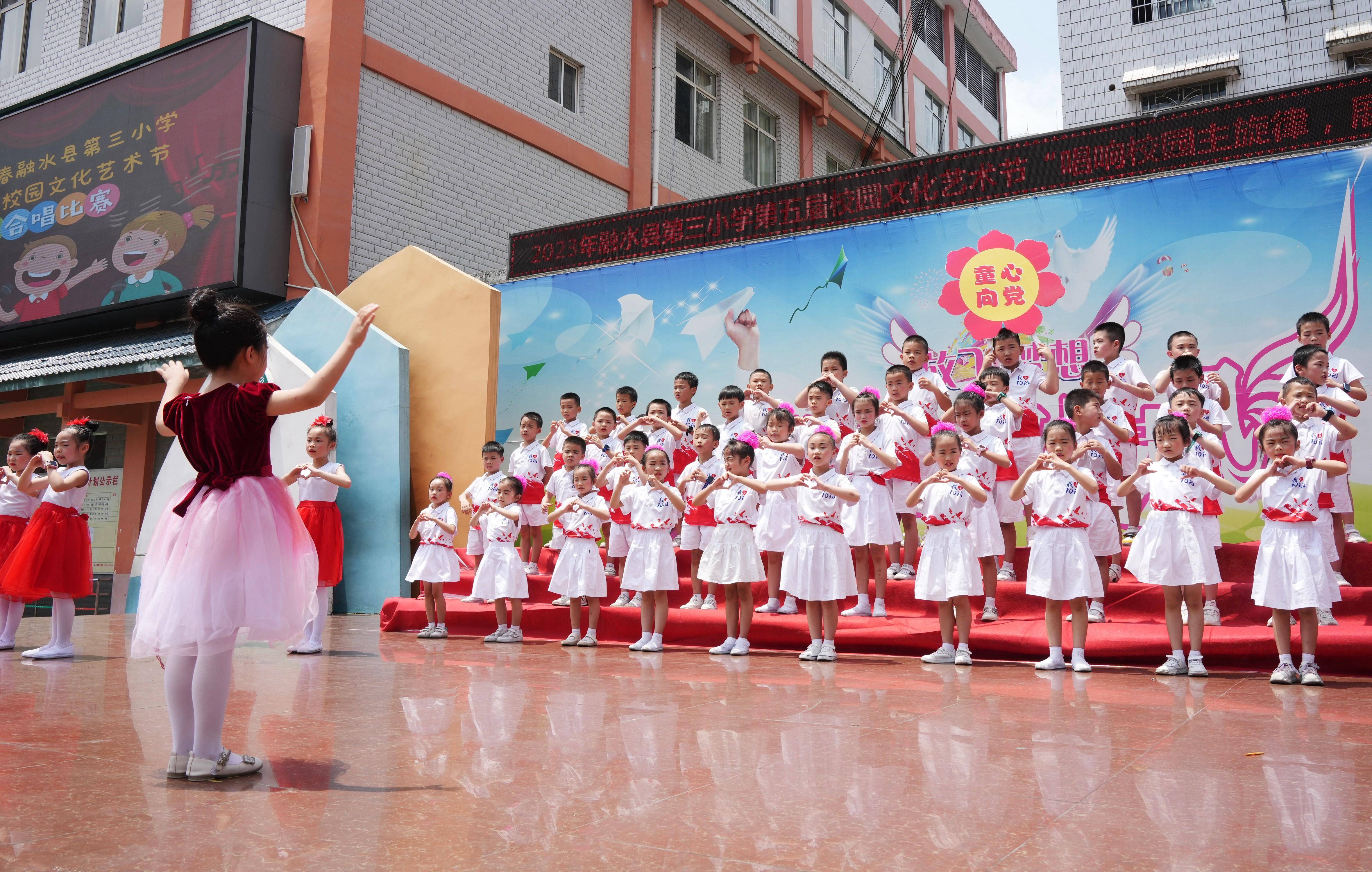 5月29日,广西柳州市融水苗族自治县第三小学学生在“庆六一”文化艺术节合唱比赛上演唱歌曲。 新华社发(龙涛 摄)