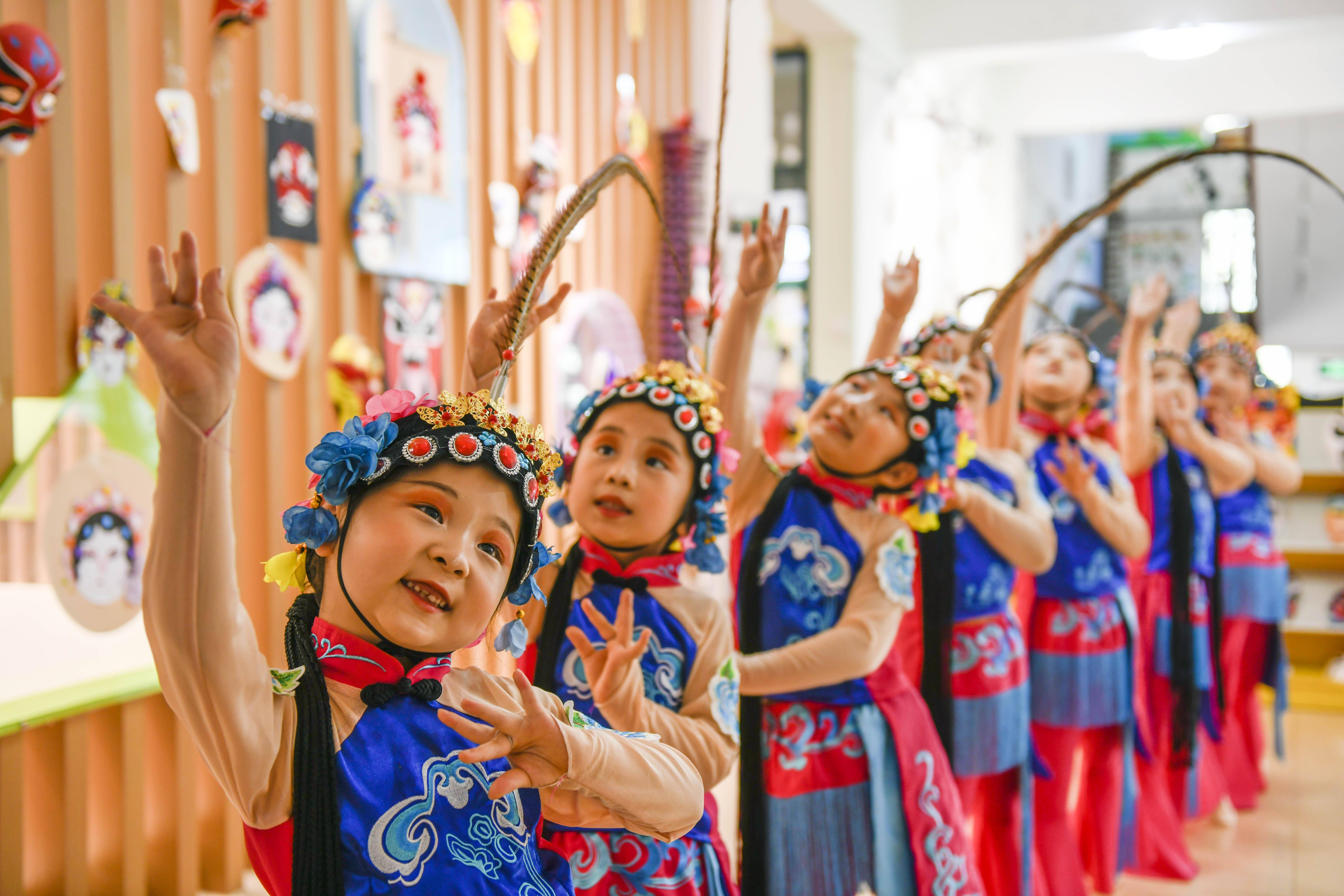 5月29日,河北省迁西县第一幼儿园的孩子们在排练京剧,为儿童节演出做准备。 新华社发(刘满仓 摄)