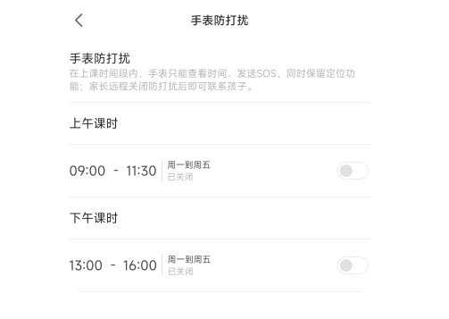不用担心,家长可以在APP端 设置防打扰模式, 在上课时间段内,手表智能查看时间、发送SOS、同时保留定位功能。