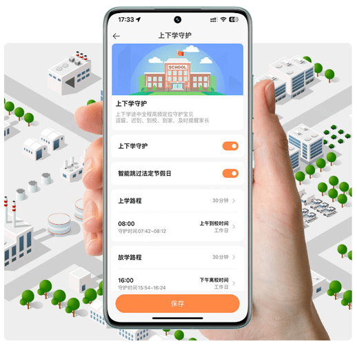 不仅如此,家长还可以在APP端对 上下学路程和到校(离校)时间进行设置,完成后,即可开启孩子上下学行程守护。