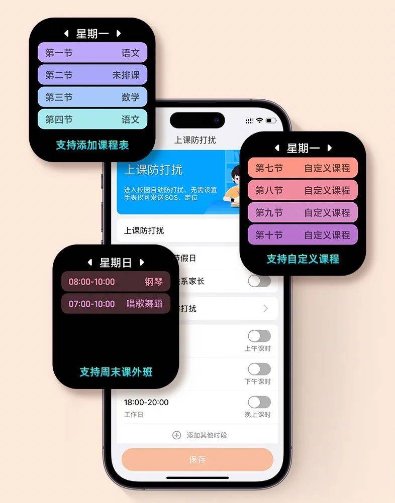 家长通过手机输入课程表内容, 校园课程、周末课外班,手表都会定时定点提醒,孩子一目了然。