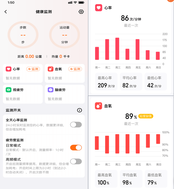 手表内置PPG心率传感器,可全天监测心率和单次监测血氧饱和度数值!