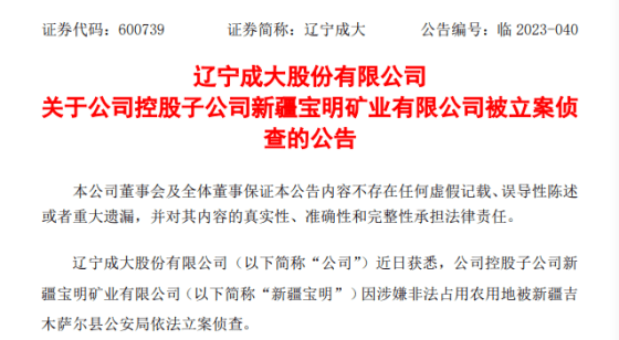 中国网财经5月30日讯(记者 张增艳)辽宁成大日前公告称,公司控股子公司新疆宝明矿业有限公司(下称“新疆宝明”)因涉嫌非法占用农用地被新疆吉木萨尔县公安局依法立案侦查。