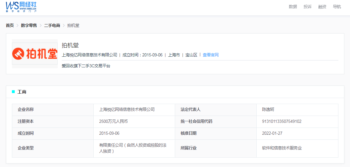 从网经社企业库(COP.100EC.CN)了解,拍机堂隶属于上海悦亿网络信息技术有限公司,该公司成立于2015年9月6日,法定代表人为陈逸轲,公司位于上海市宝山区。拍机堂属于二手交易平台,号称提供一手货源,品类齐全;多仓直发,覆盖全国;提供专业质检,精致服务。