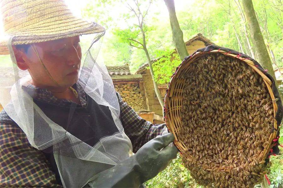 分蜂一旦开始,大批工蜂从巢门口蜂拥而出,