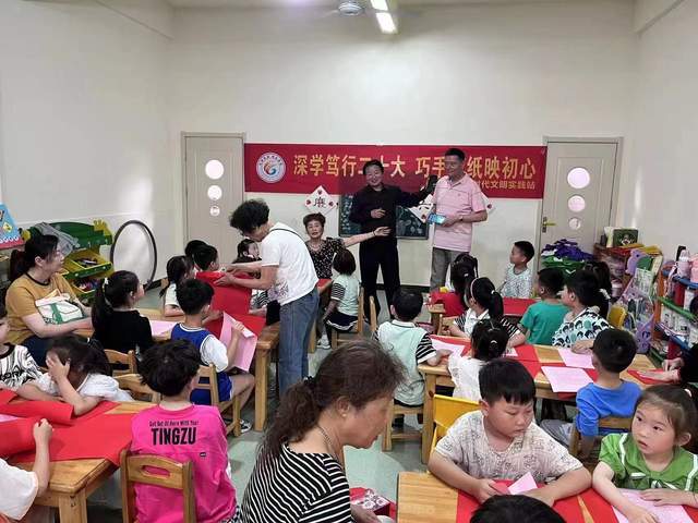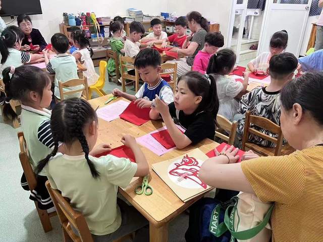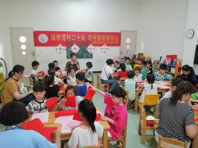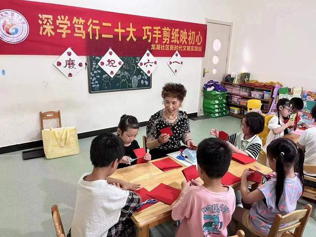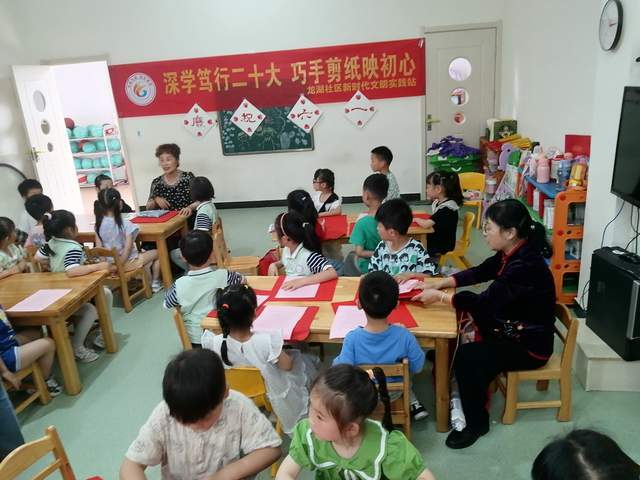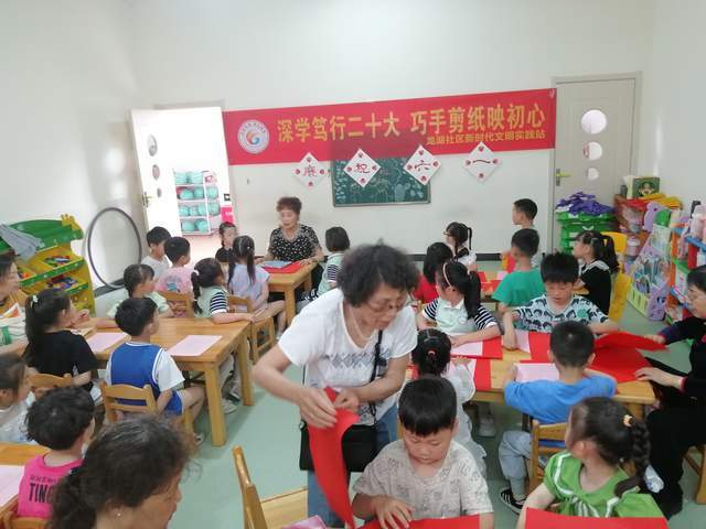 2023年5月29日下午,安徽芜湖,芜湖市老干部书画协会“剪艺苑”老师们,走进经济技术开发区龙湖社区,现场开展非遗物质文化遗产剪纸艺术公益教学,通过《深学笃行二十大 巧手剪纸映初心》——“大手牵小手”活动来培养小朋友对传统剪纸艺术的认知和兴趣,突出围绕“学习贯彻党的二十大 精神、扎实开展新时代中国特色社会主义思想主题教育活动、实施 扫黄打非 、关爱未成年人”为主题。