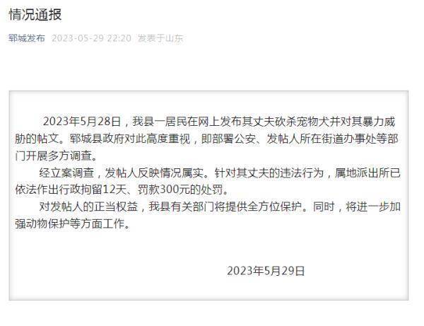 2023年5月28日,我县一居民在网上发布其丈夫砍杀宠物犬并对其暴力威胁的帖文。郓城县政府对此高度重视,即部署公安、发帖人所在街道办事处等部门开展多方调查。