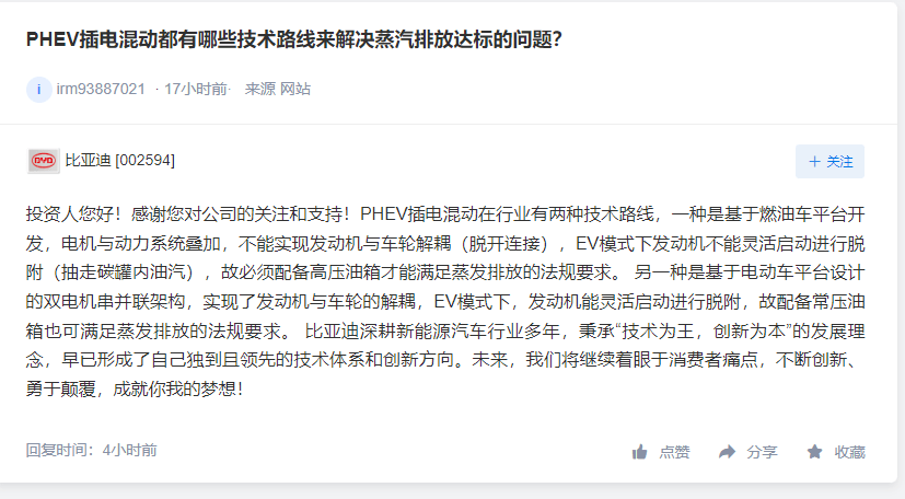 不过,PHEV 的全称是“插电式混合动力汽车”,根据电机布置的位置、驱动的方案等因素,不同车企在实现插电混动的技术路径上会有较大差异。在今天比亚迪的回复中我们也见到了类似的表述: