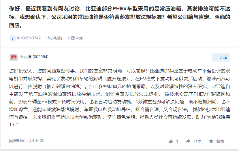 5 月 29 日上午,比亚迪在深交所互动易平台正式回应了此前关于常压油箱是否满足蒸发排放标准的争议。