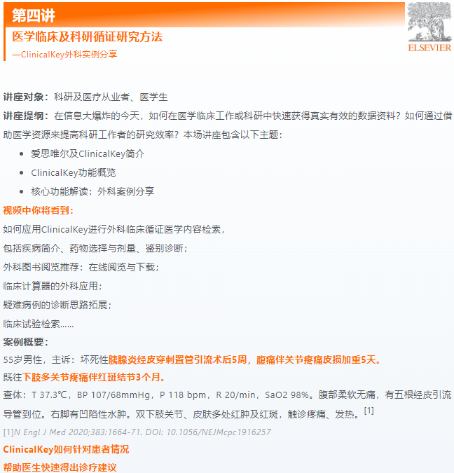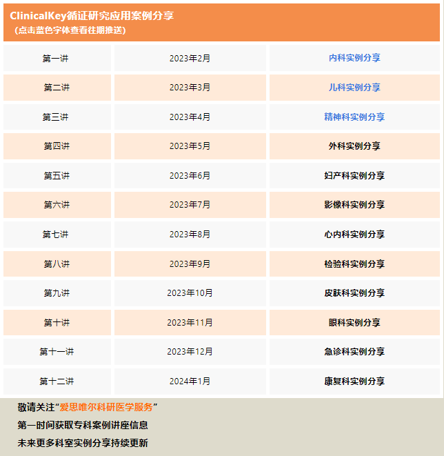 在2023年,爱思唯尔特举办“推动医路进阶”临床医师公益系列讲座,讲座共十余期,将围绕不同科室进行ClinicalKey医学解决方案的应用案例分享。